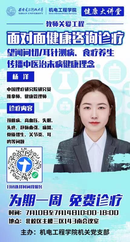 西電新聞網訊(通訊員 趙立明)7月10日至14日,為貫徹落實主題教育要求,深入開展教師關愛工程,機電工程學院在北校區舉辦“健康大講堂”,邀請中國理療研究院研究員、推拿師、健康管理師楊洋帶來面對面免費健康咨詢診療,幫助學院教職工在日常繁雜的教學科研工作中提高健康理念,本次活動吸引學院多位教職工參加。