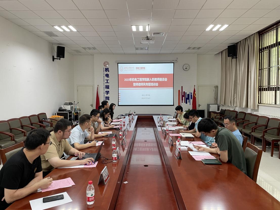 西電新聞網訊(通訊員 趙立明 楊立斌)為深入開展學習貫徹習近平新時代中國特色社會主義思想主題教育,推動調查研究走深走實,教育引導新進教師將學習成果切實轉化為履職盡責、擔當作為的實際行動,同時,為進一步加強師德師風建設,推進師德集中學習教育落實,筑牢新入職教師理想信念,明確師德師風“第一標準”,幫助其盡快適應身份和角色轉變,7月14日上午,機電工程學院在北校區主樓三區145北會議室召開新入職教師座談會暨師德師風專題培訓會。學院副院長盧琳、機關干部及學院8名今年以來新進專任教師參加會議,會議由綜合辦公室主任陳朝暉主持。