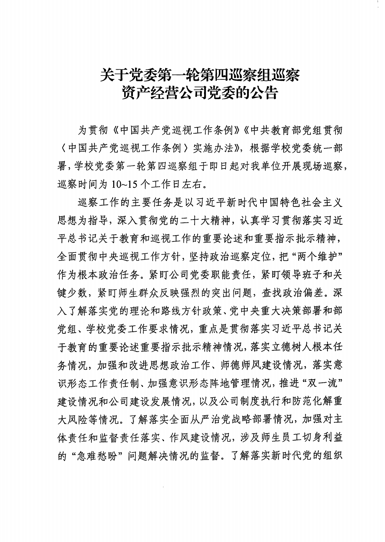 關于學校黨委第一輪第四巡察組巡察資產經營公司黨委的公告